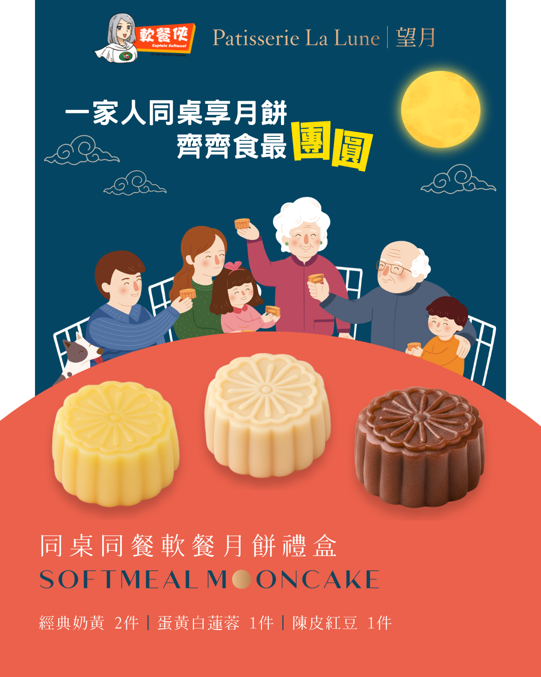 同桌同餐軟餐月餅禮盒(四件裝) 🥮 經典奶黃 2件 🥮 蛋黃白蓮蓉 1件 🥮 陳皮紅豆 1件 **此屬 急凍軟餐月餅,需於收貨後盡快存放於 -18°C 冰櫃** **急凍軟餐月餅食用期限為2025年10月15日或之前** 軟餐月餅質感描述 • 無需咀嚼,只需用舌頭力量食物就能分散 • 食用時舌頭力量需要比 IDDSI 第四級「糊狀」使用更多推動力,但比第五級「細碎及濕軟」較少 • 適合缺少牙齒或配戴不合適假牙的人士 • 適合咀嚼及吞嚥能力較弱的人士 👉 早鳥優惠:$168(原價:$180) 售賣及取貨日期 早鳥訂購日期:由即日起至2025年9月21日 取貨及現貨開售日期:2025年9月27日至10月5日 取貨地點 📍文化村門市 中環:中環干諾道中38號永安集團大廈地下E1及E2舖 北角:香港北角琴行街2A及2B號建明閣地下A舖 (近北角站B4出口) 紅磡:紅磡寶其利街123號地下4, 5A-9A舖 營業時間:星期一至日上午10時至下午7時30分(午膳時間:下午2時30分至3時30分) 軟餐食用及加熱「注意事項」 1) 每個患吞嚥困難的患者/長輩情況不一樣,因此他們的飲食需要也不同。進食任何照護食或吞嚥輔助食品前,請先向專業醫護人員了解並進行評估,才進食合適的食品。 2) 軟餐製作過程中所選用的食材或含有致敏成分例如花生、奶類、蛋等,對相關食物敏感人士敬請留意。 3) 軟餐月餅製作方式參考「國際吞嚥障礙飲食標準(IDDSI)及照護食標準指引」。 4) 建議於收貨後盡快將軟餐月餅置放於冰櫃儲存(-18 度),並於最佳日期前食用。 5) 軟餐加熱方法︰ - 解凍:從冰櫃取出後,無需解凍,可直接進行加熱。 - 加熱:拆開透明包裝袋,將月餅(蓋面向上)放入微波爐,以 500W 加熱約 1 分鐘30秒。由於不同設備的火力可能不一,可根據情況調整時間。 - 塑形:加熱完成後,軟餐月餅會呈液態狀。小心從微波爐取出後取出並打開蓋子,於室溫下擺放約10分鐘等待凝固。 - 倒模:將軟餐月餅輕輕倒扣至碟子上,即可享用。 6) 軟餐月餅建議加熱次數不可超過 2 次。 7) 進食軟餐月餅時,建議細口進食,如進食時感到不適,請立即停止進食,並向醫護人員查詢。 8) 如因不恰當方式保存、處理或食用軟餐月餅而引致的任何事件,本公司恕不負責。 訂購軟餐的「條款及細則」 1) 顧客於付款前必需確認已細閱以上的軟餐食用及加熱「注意事項」。 2) 訂單一經確定後,不能退款、顧客必須在指定日期前取貨,不能更改取貨地點。 3) 訂單需收妥全數費用後才獲確認,逾期未付款者,將被視作自動放棄訂單,The Project Futurus 將保留最終決定權。 4) 訂單確認後,顧客會收到由軟餐俠熱線 (6061 8830) 以 WhatsApp 發出的確認訂單訊息。 5) 提取軟餐時,顧客需向當值職員出示「訂單已確認」訊息以便提取軟餐。 6) 基於食物安全及衛生理由,恕不能接受退款及退換之服務。 7) 如顧客未能於指定自取日期及時間內提取相關軟餐,將當作自動放棄論,所有已繳付之費用將不設退款。 8) 如有任何爭議,The Project Futurus 保留最終決定權。如需要協助或有任何疑問,可致電 6061 8830 或電郵至